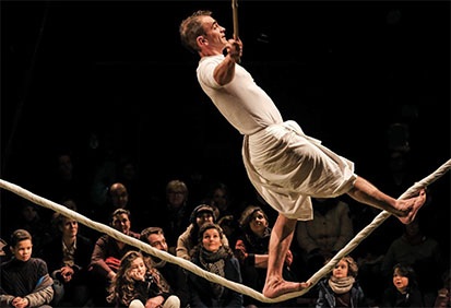 À travers une mise en scène de la pratique des arts du cirque comme outils de développement personnel, Here and Now pointe les dérives et les paradoxes de ce nouvel engouement.