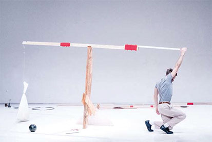 Au fur et à mesure de l’assemblage, chaque élément est interconnecté aux autres, tout en restant toujours prêt à s’effondrer. Oscillant au moindre toucher, ce jeu avec les lois de la gravité, mené jusqu’à la lisière de la chute, déploie une poétique des formes, des masses, du poids, des lignes de force qui émanent des corps et des objets en mouvement.